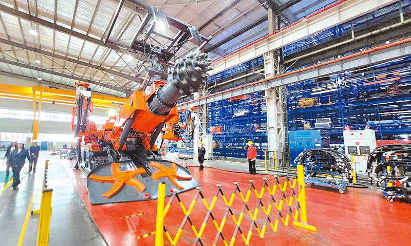 山西美佳矿业装备有限公司生产车间内工人们正在安装调试掘进设备