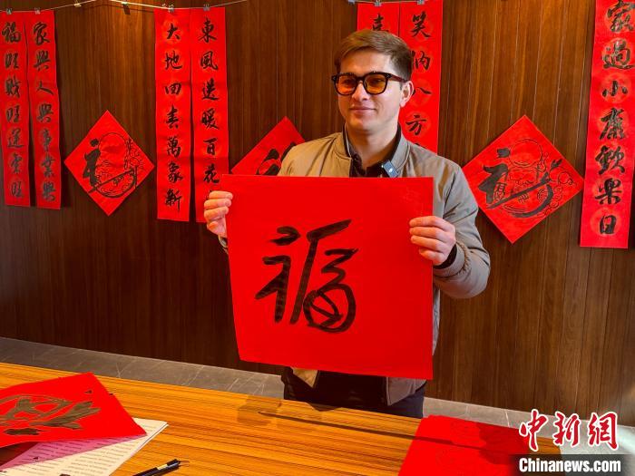 留学生海德夫展示自己写的“福”字。杨静 摄