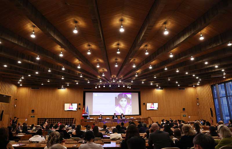 3月7日,在瑞士日内瓦万国宫,中国代表在联合国国际劳动妇女节纪念活动暨北京世界妇女大会三十周年对话会上讲话。新华社记者 连漪 摄