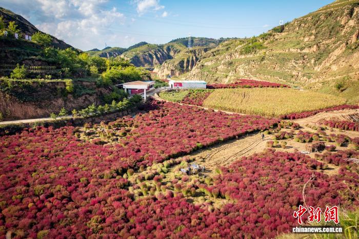 金秋时节,山西省柳林县贾家垣乡曹家沟村180亩扫帚作物进入集中收割期。漫山遍野红艳似火的扫帚草随风摇曳,将黄土高原装点成一片火红海洋。村民们抢抓晴好天气收割扫帚,田间地头呈现出一派热火朝天的丰收景象。