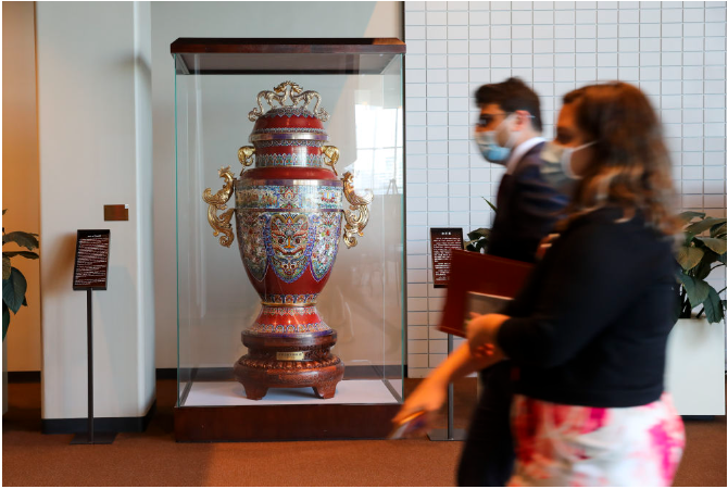 这是2021年10月21日在纽约联合国总部拍摄的中国政府赠送的“和平尊”。新华社记者 王迎 摄