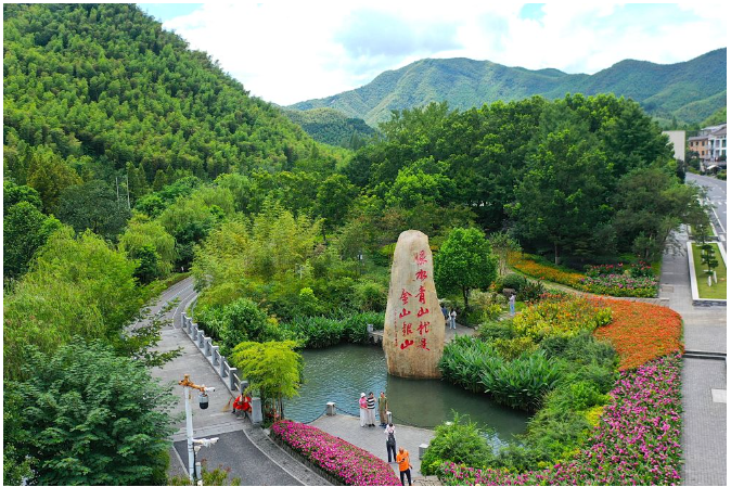 在浙江省湖州市安吉县余村,游客在刻有“绿水青山就是金山银山”的石碑前留影(2025年8月6日摄,无人机照片)。新华社记者 毛竹 摄