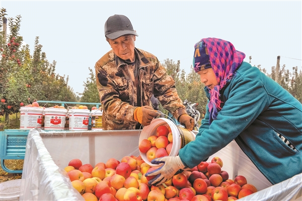 10月29日,榆次区清清苹果共享农庄内,红彤彤的苹果喜获丰收,果农忙着采摘、运送、打包。通讯员 张耀宇 摄