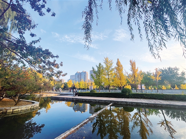市城区晋商公园,金黄、橘红与翠绿交织的美景倒映湖面 形成静谧的诗意画面