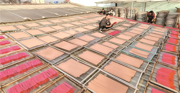 十一月十二日,在太谷区源珍香业文化有限公司,技术人员正在晾晒刚刚为订单客户制作完成的香品。近年来,该公司采用实体与互联网相结合的多元销售模式,线上借助各大电商平台,线下精心布局实体店铺,让消费者能够亲身感受香品的独特魅力。