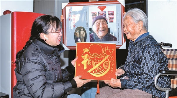 11月23日,太谷区摄影家协会组织摄影师专程走访慰问了辖区内14位百岁老人,为他们送上精心拍摄制作的“合家欢”照片、特制的长寿新年挂历及太谷区心连心志愿者协会捐赠的慰问品,用镜头记录百岁老人的幸福生活,以公益行动传递社会温情。图为105岁老人刘德莲接受慰问。