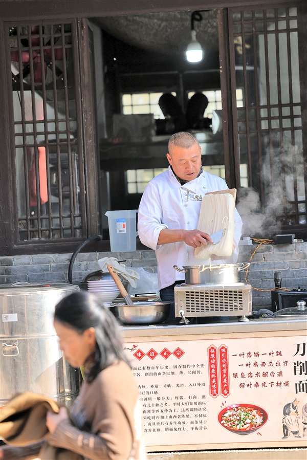 近日,榆次老城通过一系列改造后旧貌焕新颜,在保留青瓦飞檐古建群落的基础上,32家特色店铺全新入驻。漫步老城美食街,漏鱼儿、刀削面、猫耳朵、炒凉粉、寿阳猪头肉夹饼等山西各地美食小吃应有尽有。整个景区人流熙攘、美食飘香,烟火气十足。