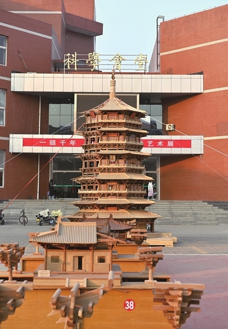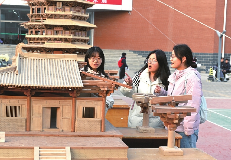 12月10日,山西师范大学内,“一眼千年·遇见山西古建艺术”户外主题展览吸引众多师生前来观展。展览将应县木塔、佛光寺、南禅寺、晋祠圣母殿等一批精美的山西传统建筑模型搬进大学校园,让师生在近距离接触中感受三晋文明的独特魅力。(王若渊摄)