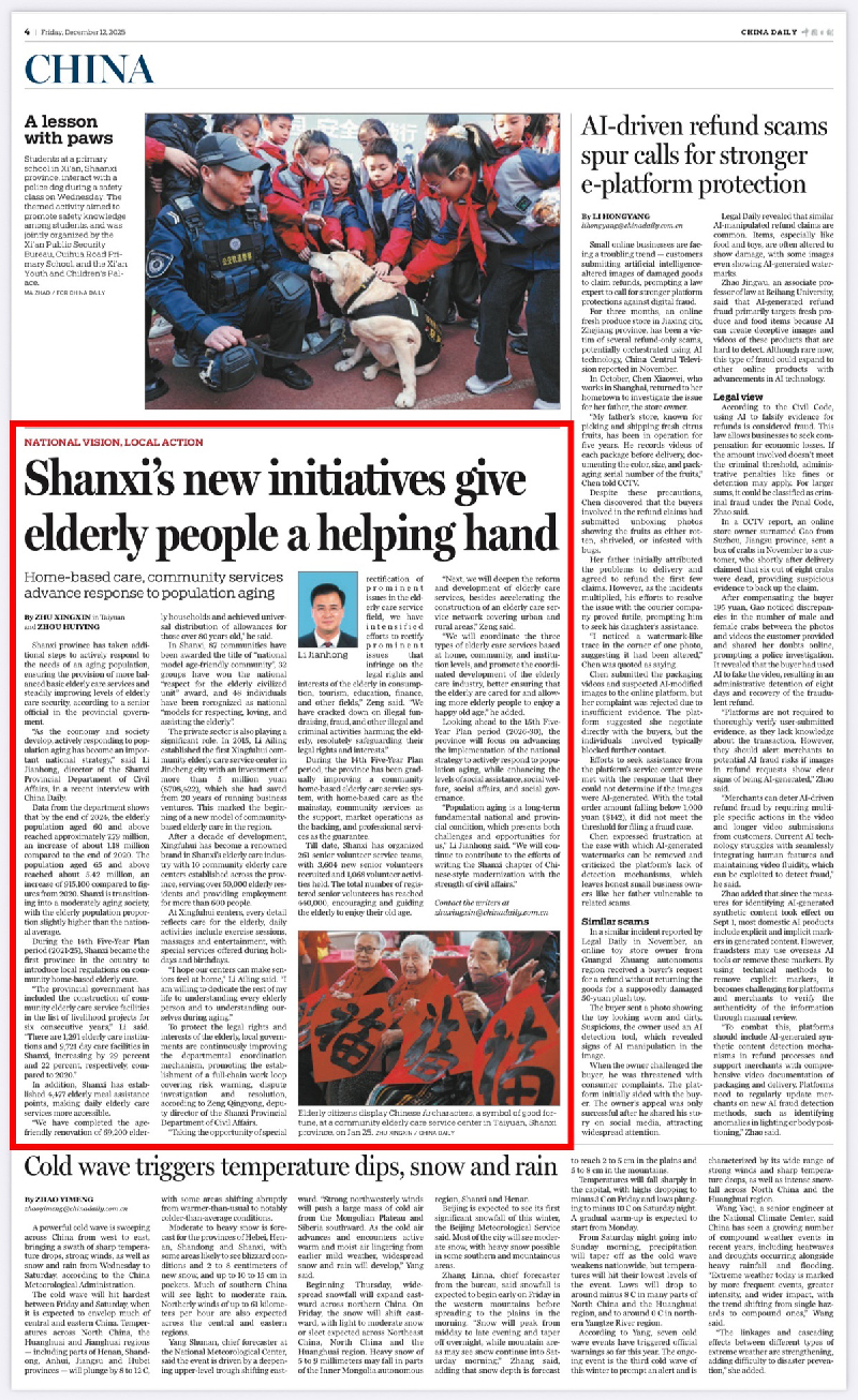 “随着经济社会的发展,积极应对人口老龄化已成为国家重要战略。”山西省民政厅党组书记、厅长李建红在近日接受《中国日报》采访时表示,“十四五”期间,山西在全国率先出台针对社区居家养老的省级地方性法规。