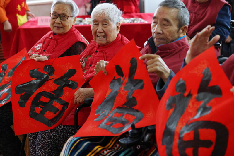 在山西省太原市一家社区养老服务中心,老人们展示着象征吉祥的中国“福”字。 朱兴鑫 摄