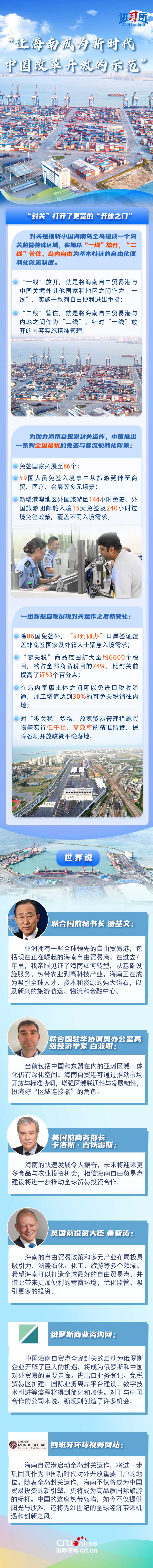 “加快建设具有世界影响力的中国特色自由贸易港,让海南成为新时代中国改革开放的示范。”中共十八大以来,在习近平总书记亲自谋划、亲自部署、亲自推动下,海南自贸港已成为中国制度型开放的新前沿、地区互利合作的新热土、推动经济全球化的新引擎。国际社会认为,海南自由贸易港启动全岛封关运作,将进一步推动全球贸易投资合作,为21世纪的全球经济带来机遇和创新之风。