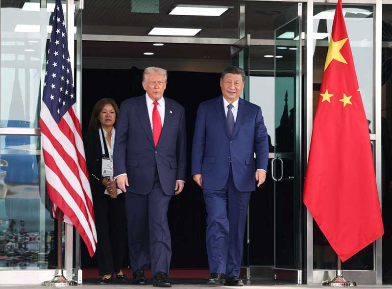把握好方向、驾驭住大局。年初以来,习近平主席同美国总统特朗普多次通电话,为稳定和改善中美关系指明方向、确定基调。10月,韩国釜山,两位领导人时隔6年再度见面,会晤超100分钟。习近平主席指出,“两国做伙伴、做朋友,这是历史的启示,也是现实的需要”;特朗普总统表示,“中国是伟大国家,习主席是受人尊敬的伟大领导人”“两国携手可以在世界上做成很多大事”。习近平主席审时度势,亲力亲为,再次引领中美关系巨轮穿越急流险滩,彰显大国领袖的自信从容和责任担当。
