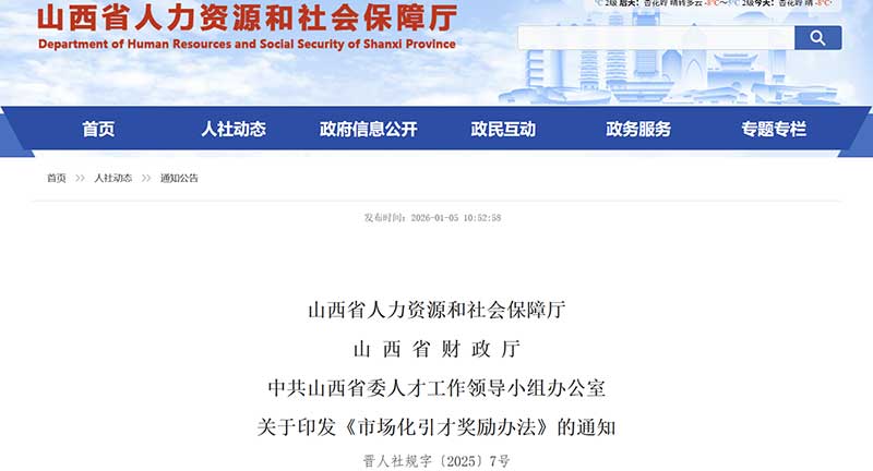 近日,山西省人力资源和社会保障厅、山西省财政厅、中共山西省委人才工作领导小组办公室联合印发《市场化引才奖励办法》(以下简称《办法》),旨在进一步推动全省猎头机构发展,完善通过猎头机构开展市场化引才机制,发挥市场配置人才资源作用。《办法》自2026年1月31日起施行,有效期三年。
