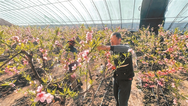 近日,山西巨鑫现代农业园区一座设施温室大棚内,由该园区自行培育的1300株春雪三号桃树花开正艳,工人们正在为进入盛花期的桃花人工授粉,游客也纷纷走进桃花丛中打卡拍照。据悉,春雪三号毛桃早熟、抗旱,比大田品种提早2个多月上市,亩产可达4000公斤。