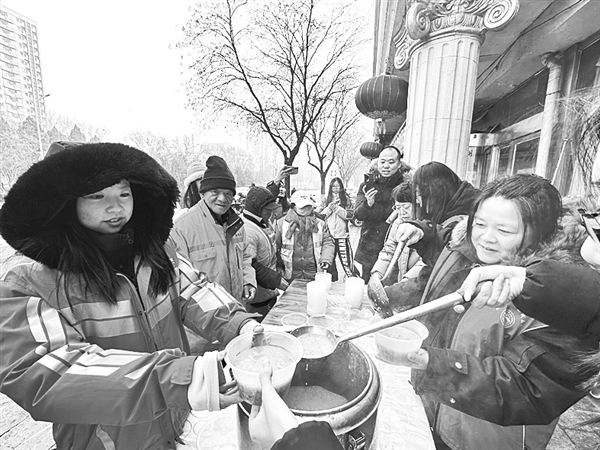 活动现场,新建西社区党委与爱心企业提前备料,熬制了美味腊八粥,在东方大酒店门口专门设立了暖心送粥慰问点。志愿者们将一碗碗热气腾腾的腊八粥,逐一分递到户外工作者手中。捧着温热的粥品,一位环卫工人动容地说:“在寒冷的冬日,喝到一碗热腾腾的腊八粥,真的很感动。这不仅暖了身子,更暖了我们的心。”这份跨越寒冬的关爱,让户外工作者真切感受到了直达心底的暖意。