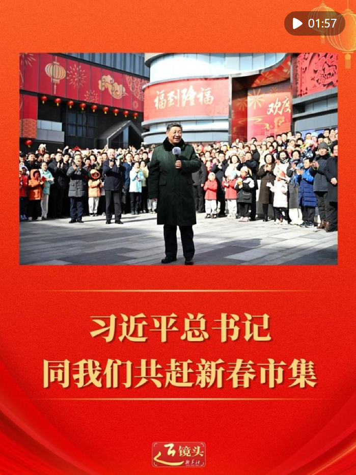 习近平总书记同人民群众共赶市集、共迎新春,是年节里最温暖的图景。总书记走到百姓中间,送上真挚的新春祝福:“在农历马年龙马精神、身体健康、事业有成、阖家幸福!”
