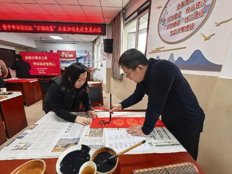 在2026丙午马年新春佳节来临之际,为弘扬中华优秀传统文化,深化党建联建共建成效,切实把党的温暖与新春祝福送到群众心坎上,尧晨社区党委携手晋中市史志室、晋中市文联、晋中市书法协会,共同开展“墨香送福万家,党建联建聚同心”活动,以笔墨为媒、以春联为载体,绘就党群同心、共迎新春的温馨画卷。