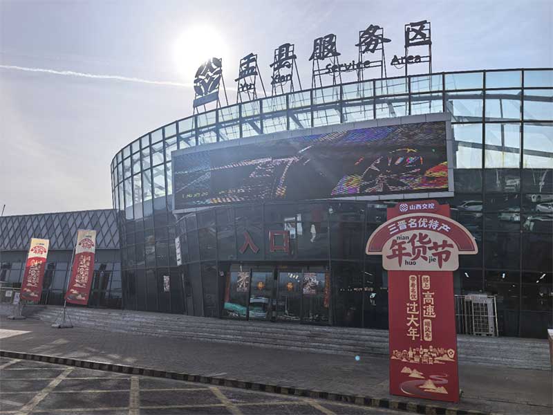 驶入盂县服务区,铺天盖地的年味映入眼帘。远远望去,红红火火的年货节拱门,电子屏上滚动着新春的祝福,喜庆的红把冬日的高速服务区衬得暖意融融。