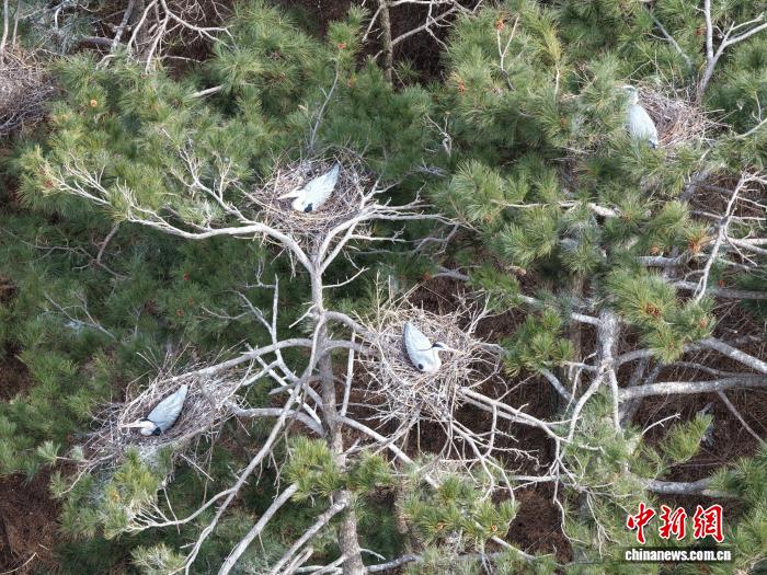 中新网吕梁3月30日电 (范丽芳 郝鹏飞)连日来,中国各地气温回升。山西吕梁山腹地的方山县积翠镇刘家庄村,春风拂过青山,草木吐露新芽,数十只苍鹭如期迁徙归巢,在村畔的高大杨树上筑巢稳窝,进入孵蛋繁育期。