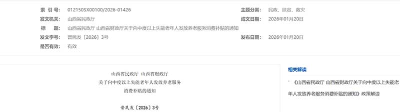 近日,山西省民政厅、财政厅联合印发通知,计划从2026年1月1日至12月31日实施中度以上失能老年人养老服务消费补贴项目,补贴资金每月最高抵扣额度为800元,通过全国统一的“民政通”政务服务平台,以电子消费券形式,按自然月发放至符合条件的老年人个人账户,助力失能老人照护服务。