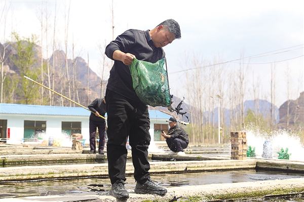 养殖池旁,饲养员轻扬手腕,饵料均匀撒入水中,瞬间引来群鱼争相抢食,水花四溅,热闹非凡。基地负责人王建蹲在池边,细致察看鱼苗长势,欣喜之情溢于言表。“我们村的水非常适合冷水鱼生长需求,无需额外净化,就能培育出高品质水产。”王建介绍,基地运营以来,产品销往太原、石家庄、山东、河北等地,订单持续不断,真正实现“好鱼卖好价”。