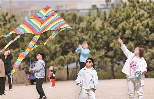 4月5日,在榆次区百草坡森林植物园,市民趁着晴好天气走出家门,享受春日放风筝的乐趣。