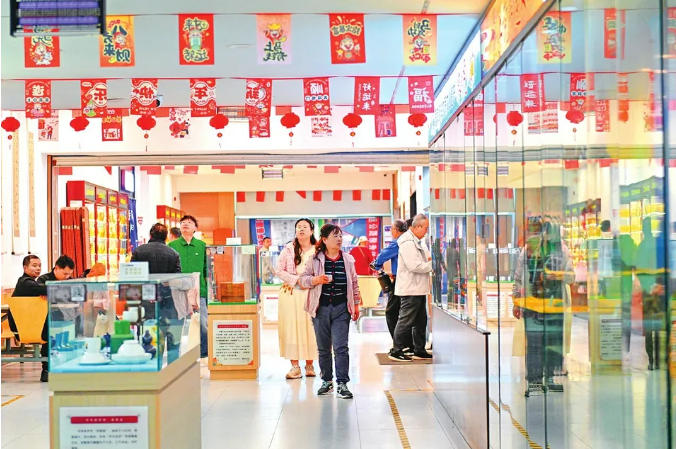 4月5日,长治高速服务区内,非遗展览吸引过往游客驻足参观。上党堆锦、黎侯布艺虎等非遗展品整齐陈列,游客在休憩间隙近距离感受三晋非遗魅力,彰显“高速+非遗”的交旅融合特色。