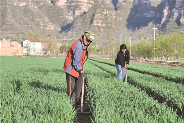 4月10日,在左权县麻田镇云头底村,农民抢抓农时,对小麦开展施肥、浇水、喷药、锄草、松土等管护作业,确保小麦丰产增收。 通讯员 刘永红 摄