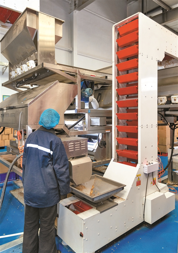 左权县山西金典农业科技有限公司成立于2022年。近年来,公司依托太行山及新疆优质核桃资源,打造集收购、加工、贸易于一体的全产业链,配备自动化破壳、AI智能色选、真空包装等先进设备,实现从剥壳到分级的全流程自动化生产,产品远销法国、韩国等国家,2025年销售收入达1.41亿元。图为工作人员在加工车间分拣核桃仁。