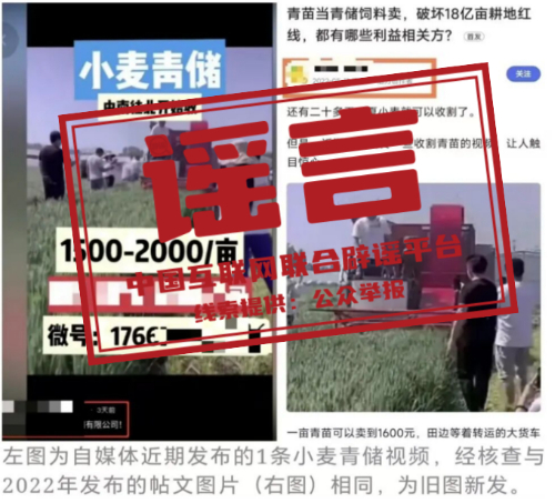 详情:近日,网上流传一些图文和视频,称“好好的小麦被割去作青贮饲料了,一亩小麦给1500元到2000元”。经核实,以上信息均系谣言。网传图片分别曾在2022年和2024年作为收割青小麦的场景出现过,属于旧图新发。而网传的收割青小麦视频,声称“近期大量出现车队诱导农民割小麦当青贮”,但视频中,小汽车直接开进了麦田,有的汽车甚至只有半截车身,明显是AI生成的。