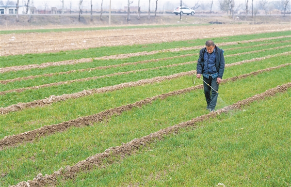 平遥县洪善镇小沿村村民在田间为小麦喷洒除草剂